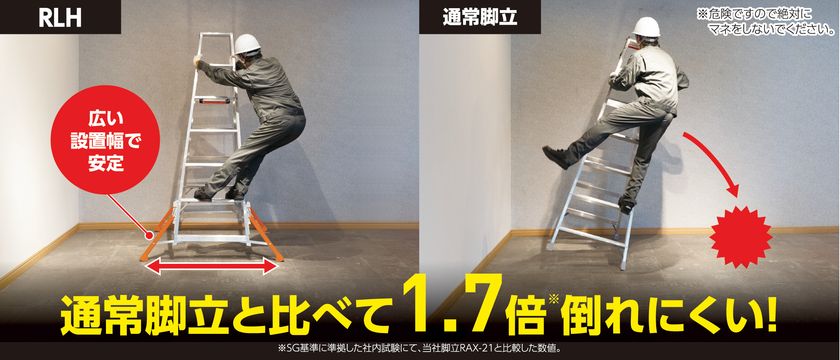 アウトリガー脚立ハチ型(RLH)と当社通常脚立との転倒比較