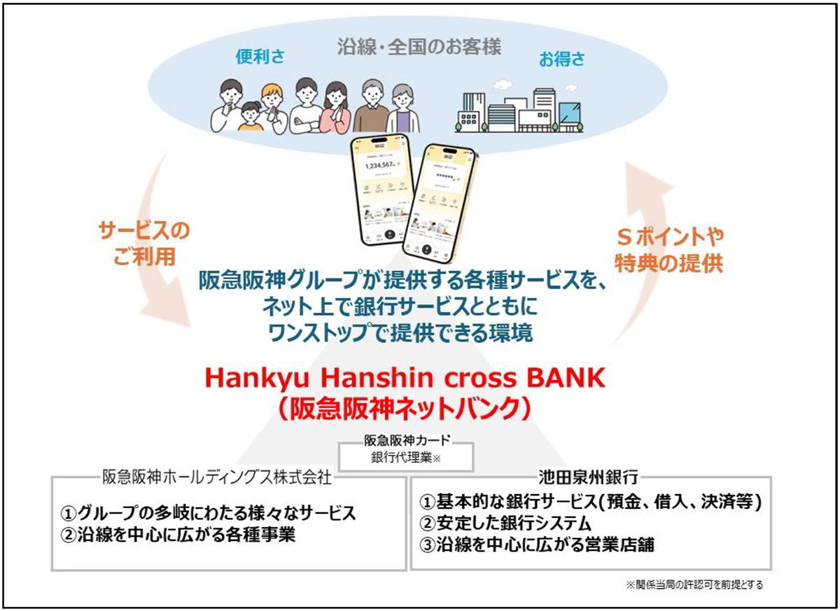 本サービスでは、当社グループが提供しているさまざまなサービスと銀行サービス(預金や借入、決済等)をスマートフォンアプリによりワンストップでご利用いただける環境を整えます。お客様の利便性や快適性の向上に加え、当社グループとお客様との接点を強化することができ、当社が推進する阪急阪神DXプロジェクト※3の推進にも寄与すると考えています。さらに、ご利用状況に応じて、阪急阪神グループの共通ポイント「Sポイント」や、グループで利用できるさまざまな特典を進呈するなど、よりお得な銀行サービスを提供します。