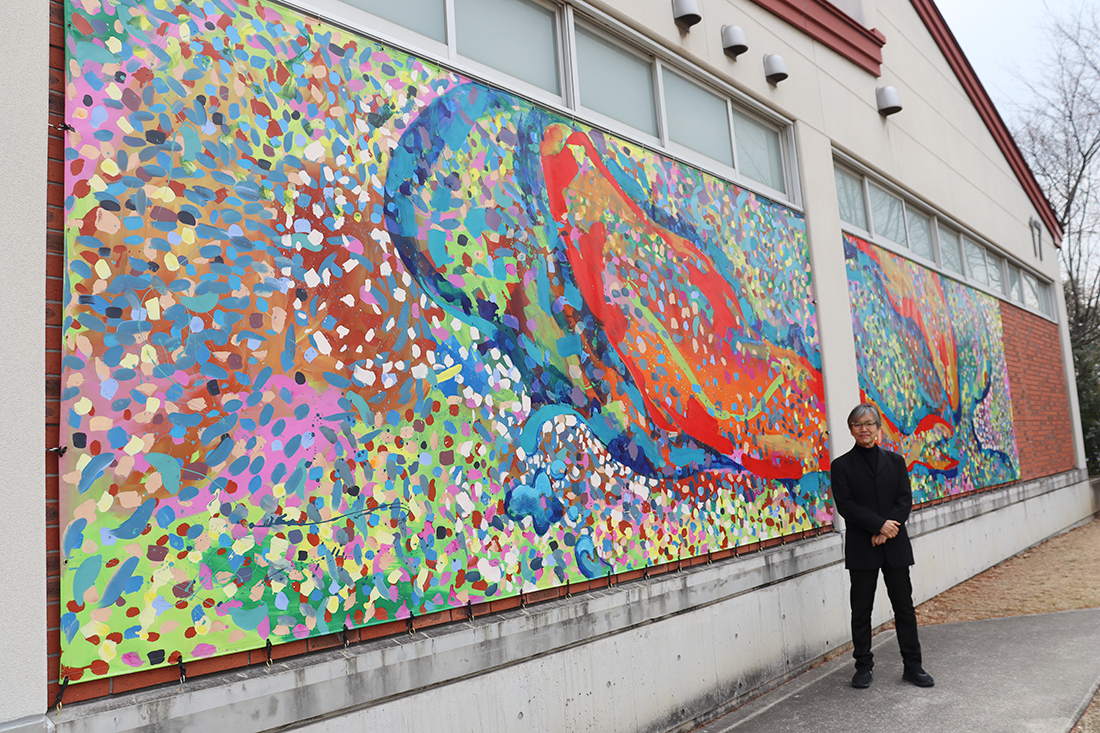 まずキャンパスで目を引くのは、17号館西側の壁面に描かれた色彩豊かな抽象画です。縦2.3㍍、横5.3㍍のテント生地2枚に、瀬戸内の海と芸術・科学の融合をテーマに芸術学部と生命科学部の学生14人が思い思いの絵を描きました。1月27日に完成したばかりです。昨年開学30周年を迎えた同大の記念行事と位置づけ、コンセプトは「30年の汚れを修復するのではなく、次の10年に向けて常に新しい表現が生まれる“創造の場”とする」としています。