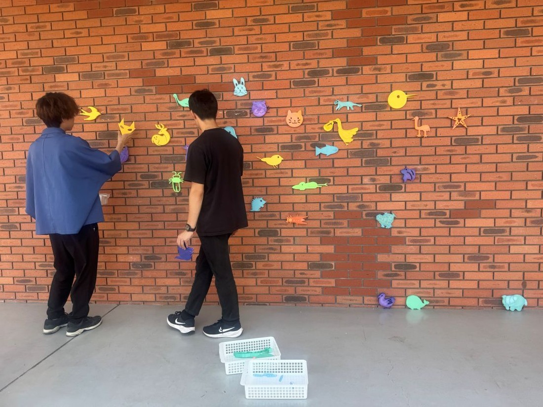 「壁面プラ継ぎ」を取り付ける学生たち(芸術学部・原田明夫研究室提供)