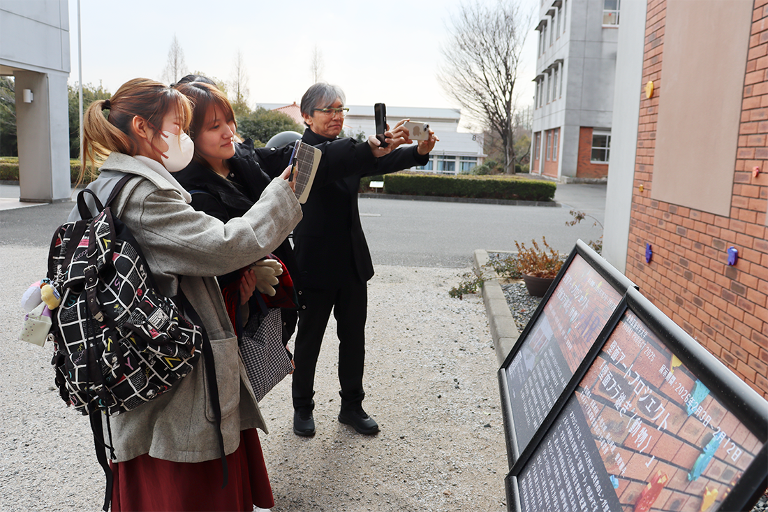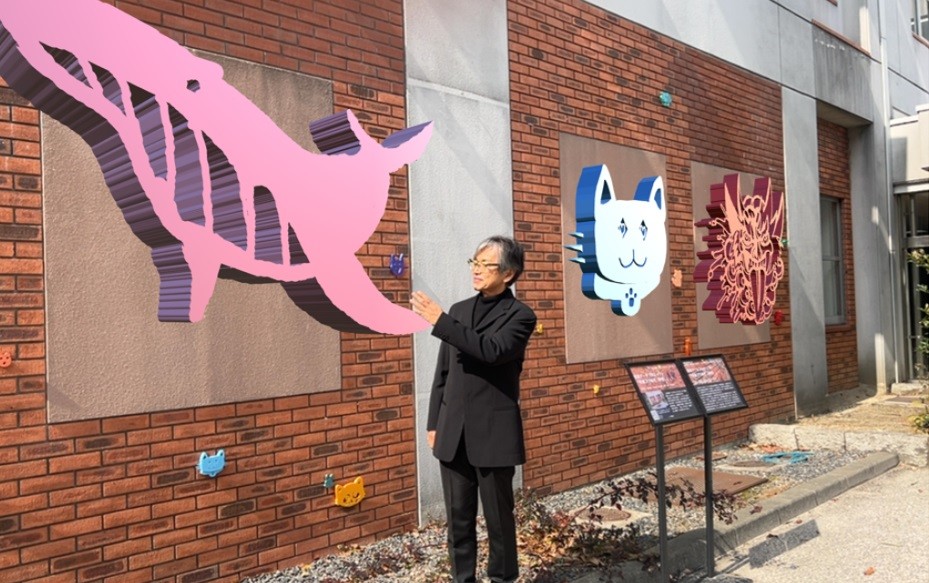 2号館のレンガの壁にはカラフルな動物たちが彩り豊かに取り付けられています。学生たちがデザインした作品を3Dプリントで、「壁面プラ継ぎ」とネーミングしてレンガのつなぎ目にぴったりとはめ込みました。この前に設置された説明版からスマホでQRコードを読み取ると、壁面から動物たちが3Dで浮き上がるAR(拡張現実)の仕掛けも。