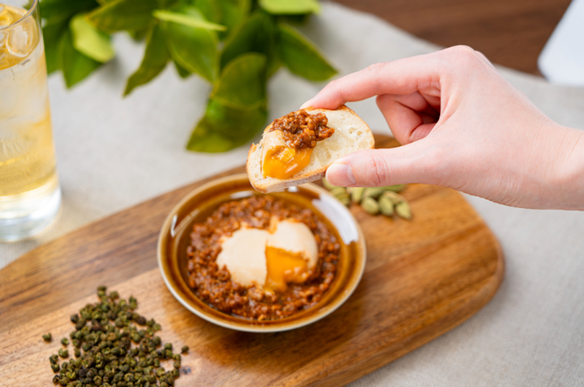 本商品は、とろりと黄身が流れ出るたまごに「スパイス」×「創作中華」をコンセプトとした特製ソースを合わせた一品です。特製ソースは、コク深いオイスターソースをベースに、山椒の刺激とカルダモンの爽やかな香りを絶妙なバランスで配合しました。フライドガーリックのアクセントに加え、濃厚な卵黄がソースと絡み合うことで、より一層深みのある味わいをお楽しみいただけます。