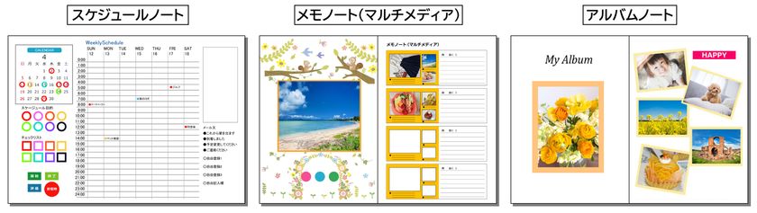 基本ノートは、日常生活の感性豊かで便利な「スケジュールノート」と、必要な時に簡単記録のマルチメディア「メモノート」、日々の生活や非常時にも対応の「チェックリスト」で構成されます。
