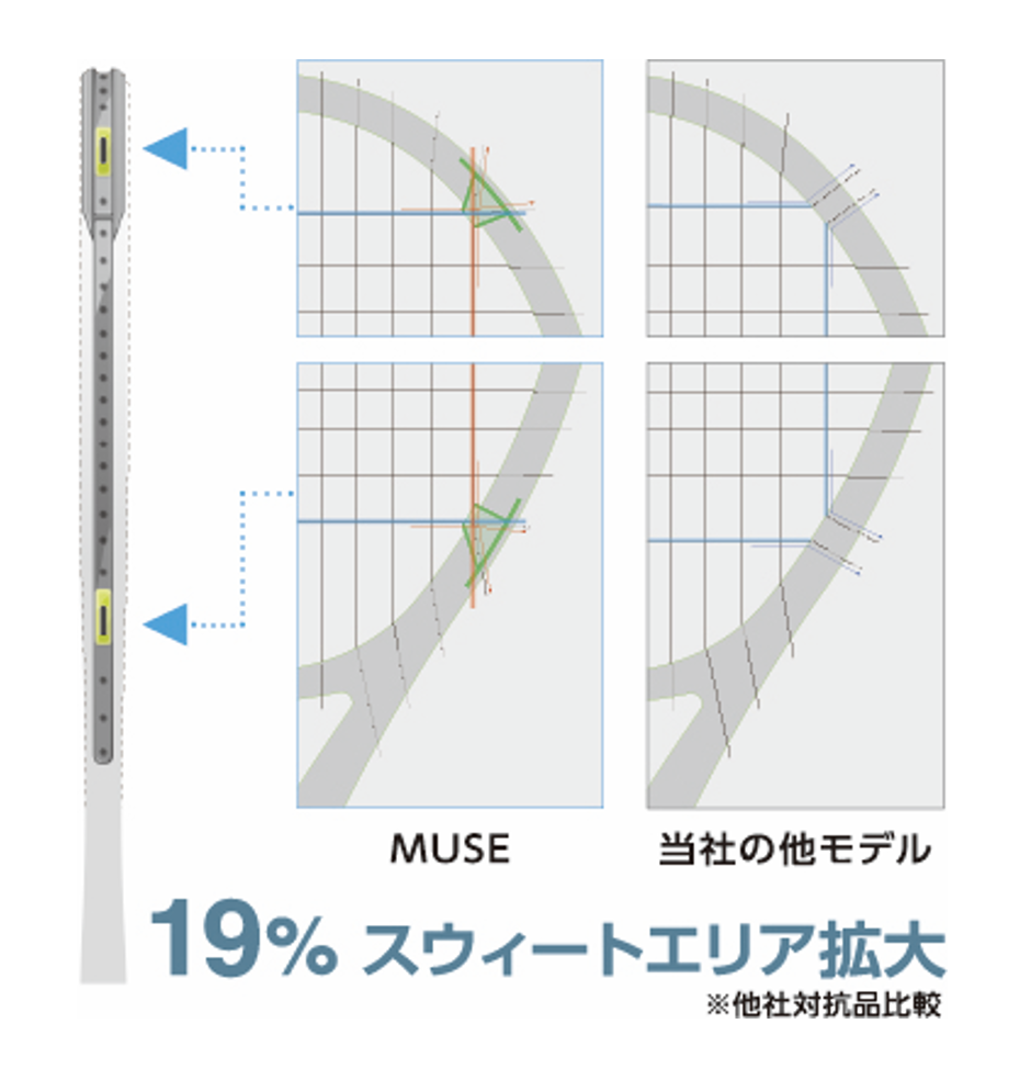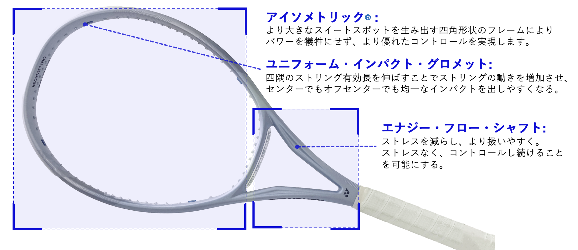 フレームには、独自の形状理論「アイソメトリック®」を採用し、一般的な円形ラケットに比べ上下左右に7%※広いスウィートエリアを実現。また、世界初の四隅ストレート配向を採用した独自設計「ユニフォーム・インパクト・グロメット」により、ストリングの可動域を拡大しました。センター・オフセンターを問わず、均一で安定した打球感を生み出します。