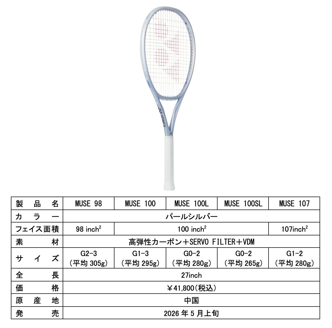ヨネックス株式会社(代表取締役社長:アリサ ヨネヤマ)は、“ヨネックスで最も扱いやすいテニスラケット”をコンセプトとし、楽しくラリーに集中できるよう設計した中上級者向けテニスラケット、新シリーズ「MUSE(ミューズ)」を2026年5月上旬より発売いたします。