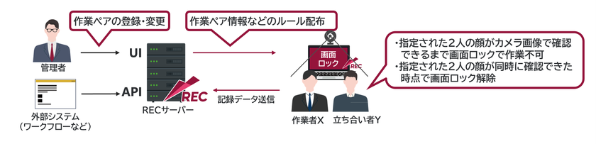 V6.2では、登録済みのユーザーのうち、特定の2名がペアで作業を行うことを可能にする「ペア設定機能」が新たに提供されます。REC管理サーバーにあらかじめペアとなるユーザーの組み合わせ「作業ペア」を登録しておくことで、その設定が監視端末に配布され、ユーザーは各端末で、指定された「作業ペア」での操作が強制されます。