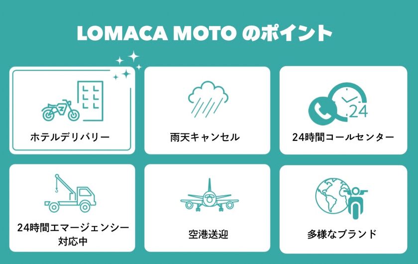 24時間対応、空港・ホテルへの配送&回収、多言語サポート、ツーリングコーディネーター対応、24時間エマージェンシーサポート、キャリーケース等の手荷物お預かりサービス。