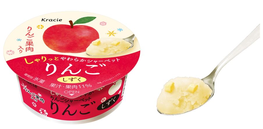 やわらかいさじ通りの中に、シャリッと心地よい氷晶感を取り入れることで、りんごらしい食感を表現しています。さらに、ダイス状のりんご果肉も加え、食感と味わいのアクセントをお楽しみいただけます。