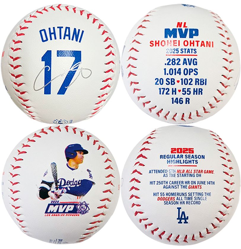 大谷選手の勇姿を再現したフィギュア、決定的瞬間のMLB承認フォト、そしてシーズンの詳細な成績が刻印された記念ボールのセットです。