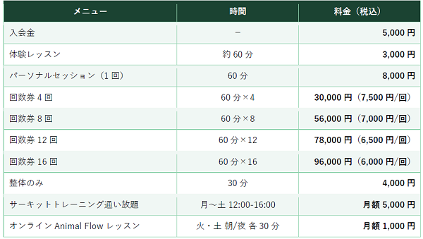 さらに、Zoomを使ったオンラインAnimal Flowレッスンも開講中。毎週火曜・土曜の朝7:00~7:30と夜21:00~21:30の1日2枠で、全国どこからでも参加可能です。店舗への入会は不要で、月額1,000円(税込)から始められるため、Animal Flowを気軽に体験してみたい方にも最適です。お申し込みは公式LINEよりお受けしています。