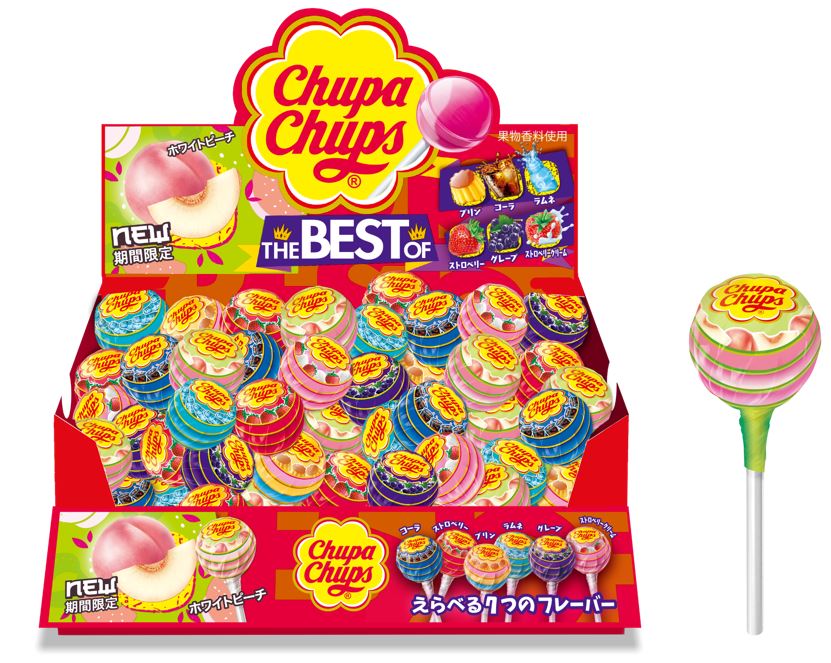 「チュッパチャプス ザ・ベスト・オブ・フレーバー」は、その時の気分に合わせて7つの人気フレーバーからお好きなものを楽しめるロリポップ(棒付き)キャンディです。