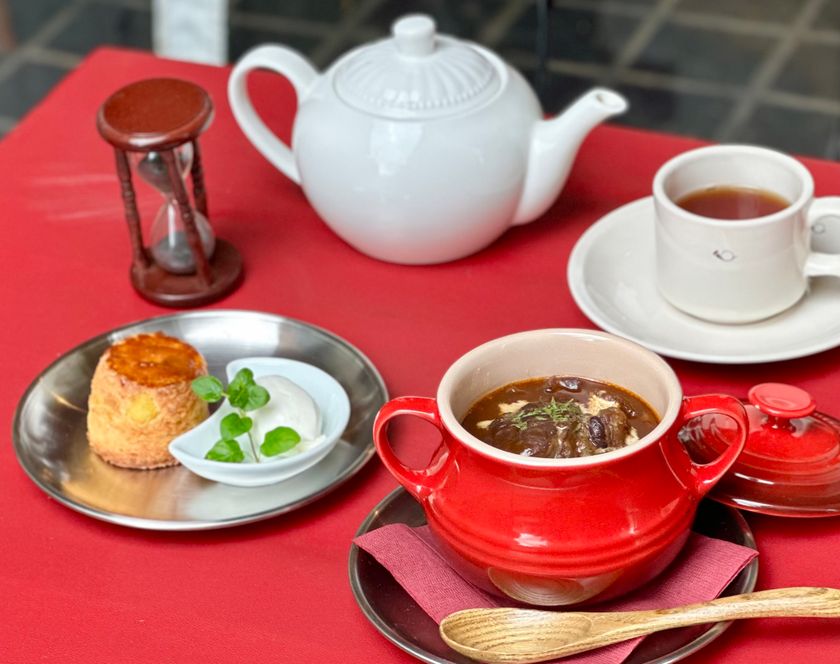 工場1階にはカフェを併設。名物「三芳ビーフシチュー」や焼きたてのスコーンを提供します。絵の具職人の仕事や展示されたアート作品を眺めながら、制作の合間や仲間との語らいの時間をお楽しみいただけます。