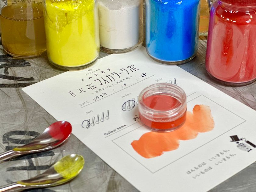 月光荘の絵の具と同じ原料を使い、自分だけの絵の具を調合。オリジナルネームを付けて持ち帰ることができます。色づくりの工程に触れる、小さな文化体験です。