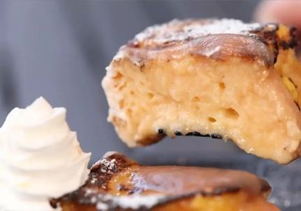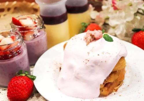 福岡産「あまおう」を練り込んだ食パンを使用したフレンチトーストに、桜色のクリームを添えた春限定のデザートです。