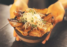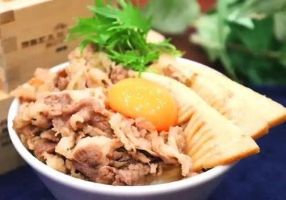 国産牛と、春が旬のタケノコを、福岡の大吟醸酒を使用した甘辛仕立てで炊き上げた、季節限定のすき焼き丼です。