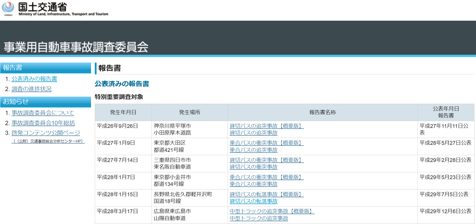 国土交通省の事業用自動車事故調査委員会は、社会的影響の大きい事業用自動車の重大事故について、事故原因の究明と再発防止策の提言を目的とした事故調査報告書を公表しています。