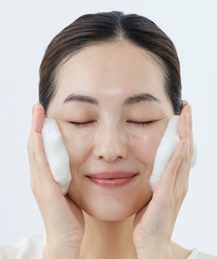 弾力と吸着力のある泡による洗顔と32°Cの日向水(ひなたみず)すすぎがキメをやさしく守りながら、肌を解きほぐします。