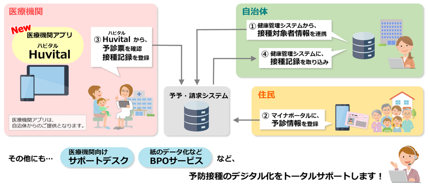 また、住民・医療機関向けには、当社BPOセンターが紙の予診票のデータ化や接種記録の登録を代行し、紙とデジタルが混在する移行期でも、負担削減に貢献します。
