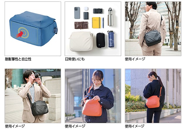 前面と背面に同じデザインの大型ポケットを備えたシンメトリカルでスマートなフォルムのミドルサイズショルダーバッグです。約360gの軽量設計により、機材と小物を効率よくまとめて軽快に持ち運ぶことが可能。メイン収納部の中仕切りを外せば、手頃なサイズ感のデイリーバッグとしても活躍します。