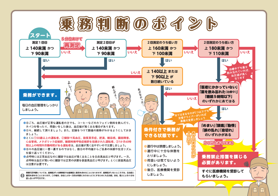 全日本トラック協会より、点呼における血圧測定のガイドラインが配布されています。日々血圧を測定することが推奨され、乗務可否の業務フローも示されています。