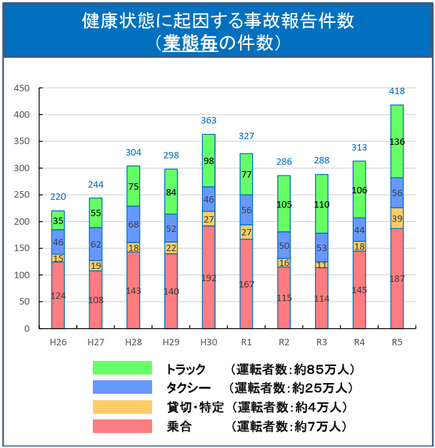 運輸業界では、ドライバーの健康起因による事故は中長期的には減少傾向にあるものの、直近では再び増加もみられ、依然として重要な安全課題となっています。