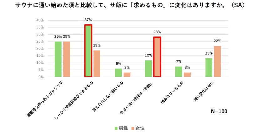 また、サ飯に求めるようになったものを男女別で比較すると、男女ともに、しっかりとした食べ応えや満腹感を求めており、男性サウナーは「しっかり栄養補給(たんぱく質やミネラルなど)できるもの(37%)」と回答した人が一番多い結果となりました。一方、女性サウナーは「辛さや強い味付け(刺激)(28%)」と回答した人が一番多く、