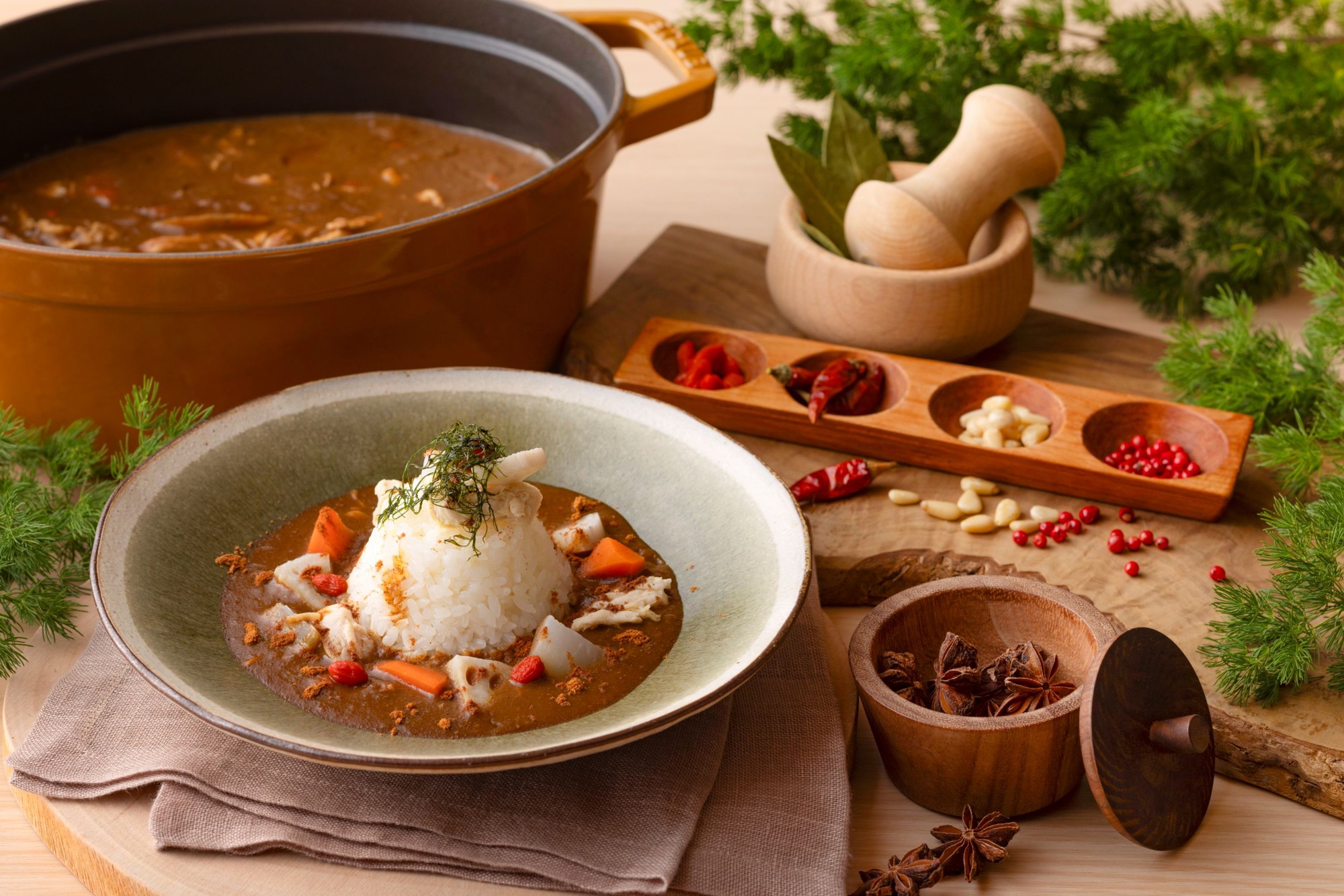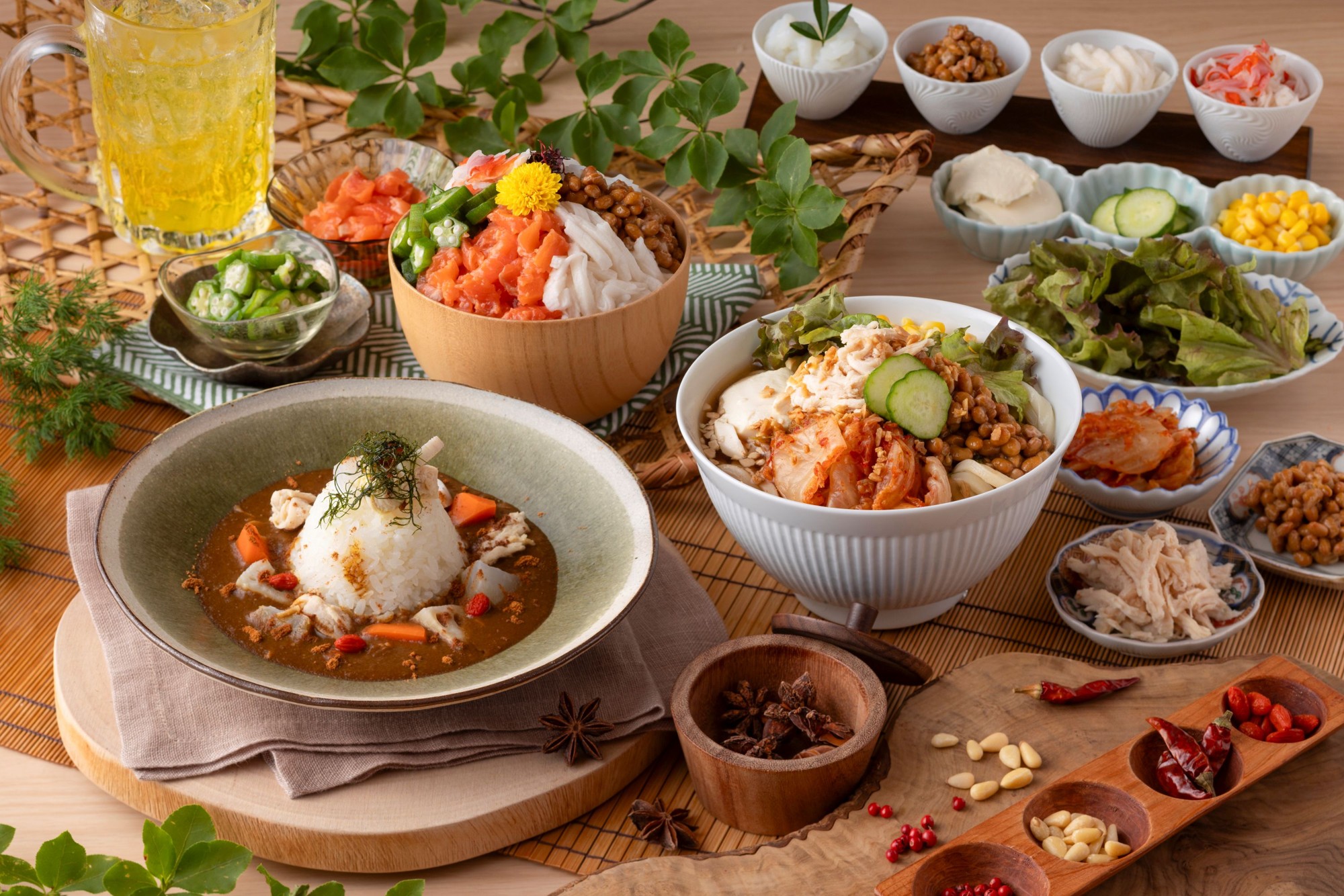 夕食バイキングでは、バイキングの楽しみ方を紹介いただきました。オリジナルの前菜はどれも彩りよく、バリエーションも楽しめるので、ぜひ皆様にも真似ていただきたい内容となっております。また、大江戸温泉物語グループの中で、Premium よしのや依緑園のみで提供している〈サウナ飯〉スパイス香る「薬膳カレー」やスタミナ満点の「海鮮トロトロ丼」もお召し上がりいただきました。