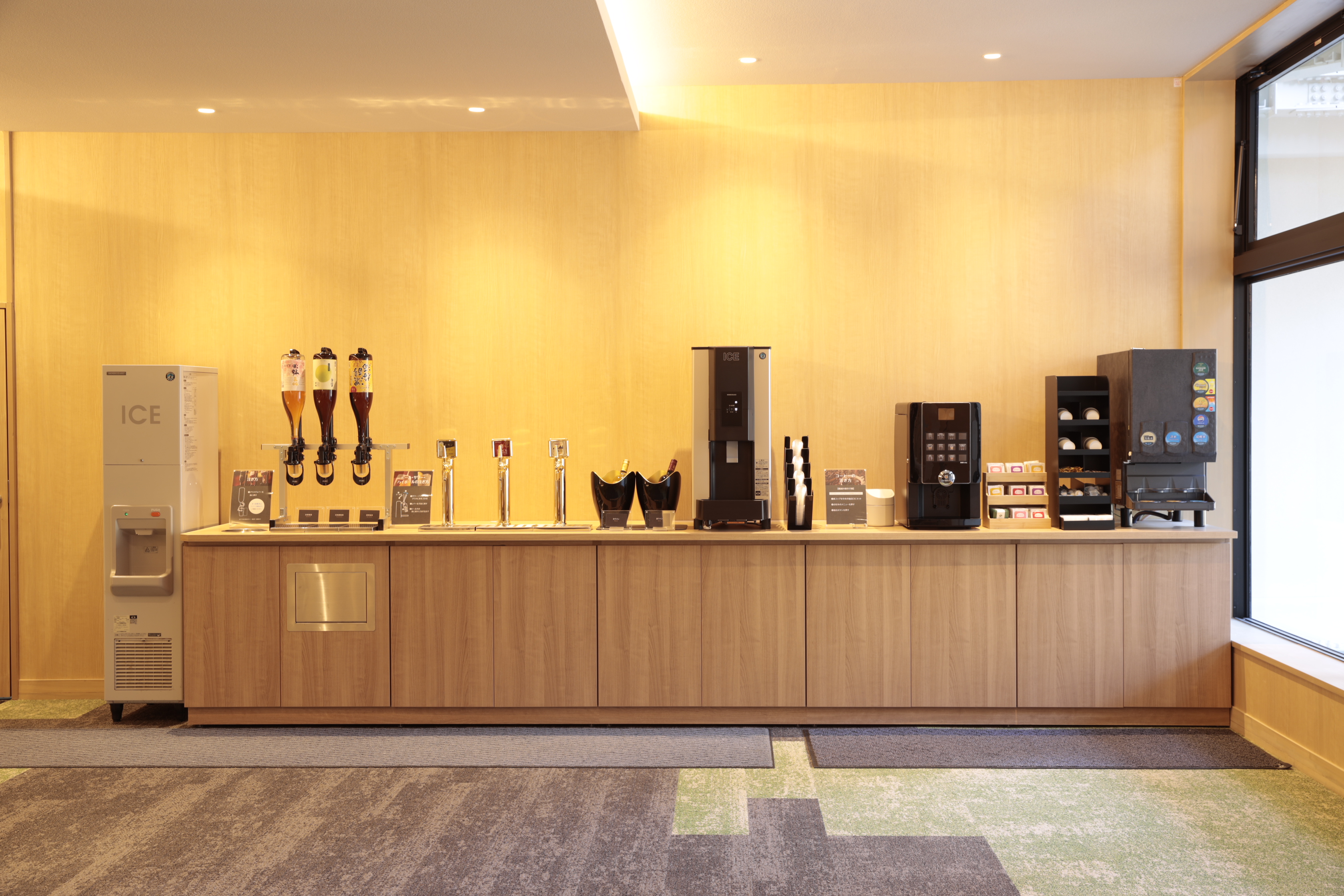 Premium よしのや依緑園では館内に3箇所、ソフトドリンクやアルコールが飲み放題のラウンジをご用意しております。チェックイン前はウェルカムドリンクとして、サウナご利用後の水分補給など気軽に料金を気にせず、何度でもご利用いただけます。