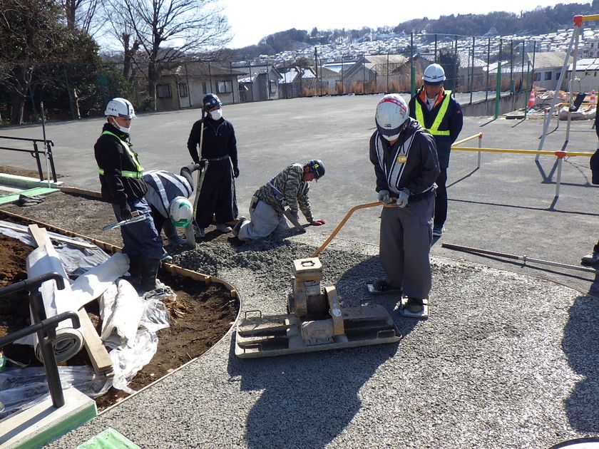 「西平山あそびば」でCPコンクリート製のベンチを打設し、養生時にもCO2を固定する作業を実施(写真1、2)