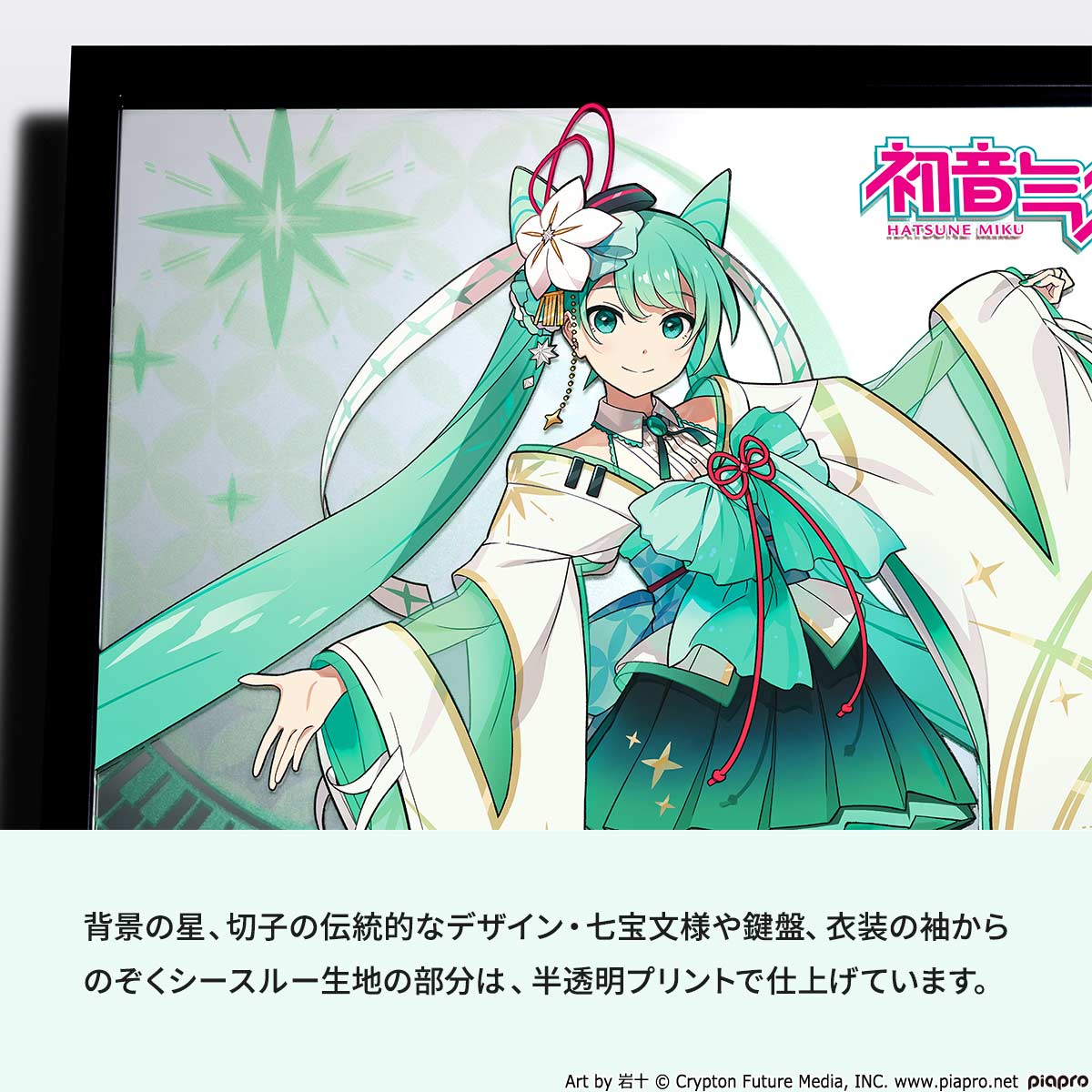 優雅なミクグリーンの衣装を引き立てる、ブラックの木枠に額装しています。