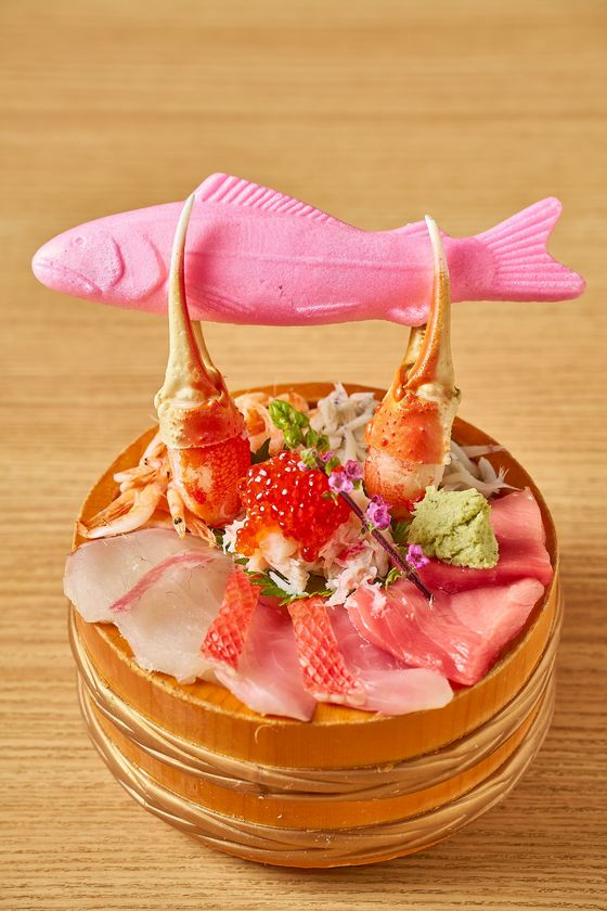 旬の真鯛をはじめ、本マグロ、金目鯛、桜えび、しらす、カニ、いくらと魚の形をした桜最中。カニが高く持ち上げる最中は、思わず「お魚とったどー!」と声に出したくなること間違いなし!