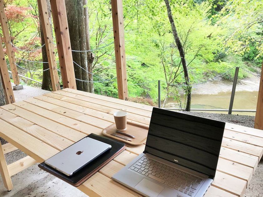 粟又の滝を正面に望む絶好のロケーションに2024(令和6)年にオープンした「滝見テラス」は、開放感あふれるリラックス&ワーケーションスポット。木の香りが漂う全8室の個室テラスには、電源口やWi-Fiが完備されており、滝音や川のせせらぎ、鳥のさえずりをBGMに、非日常的な環境で作業することができます。
