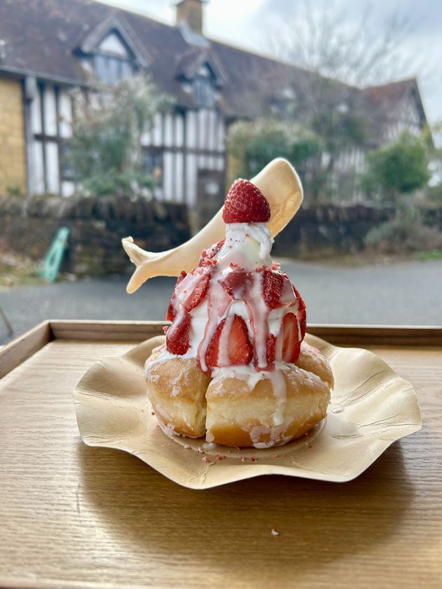 シュガードーナツにみねおか牛乳ソフトと南房総産いちごをこんもりと盛った頂上ソフト。見た目も華やか、食べ応え抜群!