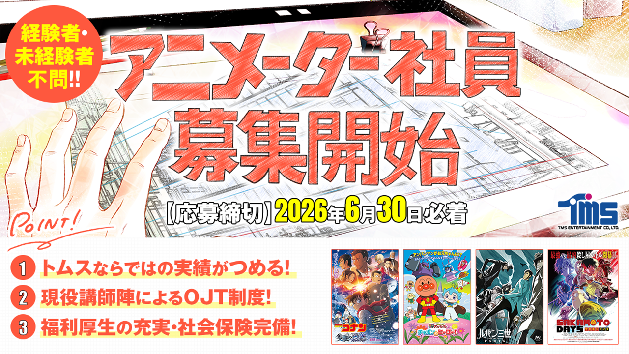 そしてこの度、2027年4月を採用時期として、未来のアニメ制作を担うアニメーター社員の募集を開始しました。入社後は、現役のアニメーターが講師としてサポートし、基礎知識の習得が出来るOJT制度を整えており、経験者はもちろん、未経験者でも安心して働くことができます。また、福利厚生も充実しており、安定した生活基盤を確保しながら、着実に成長できる環境です。