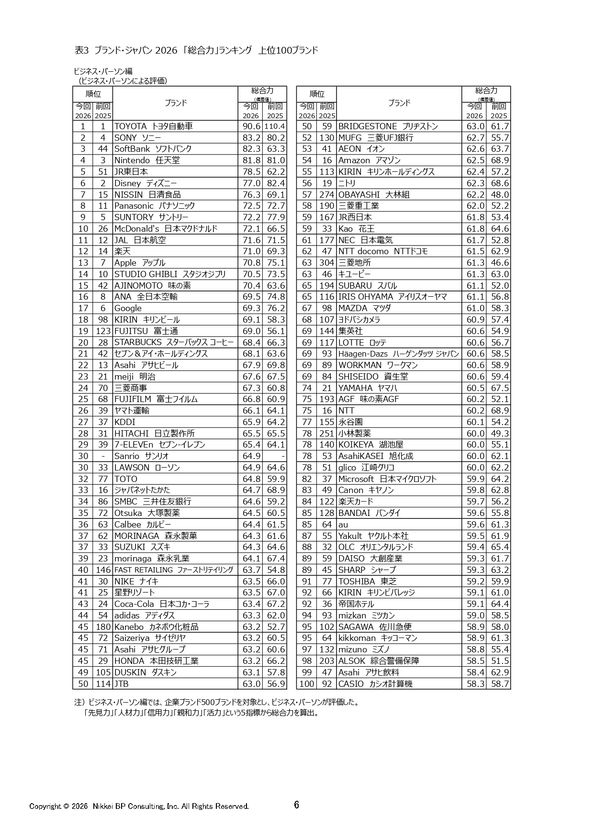 表1 ブランド・ジャパン2026「総合力」ランキング 上位100ブランド