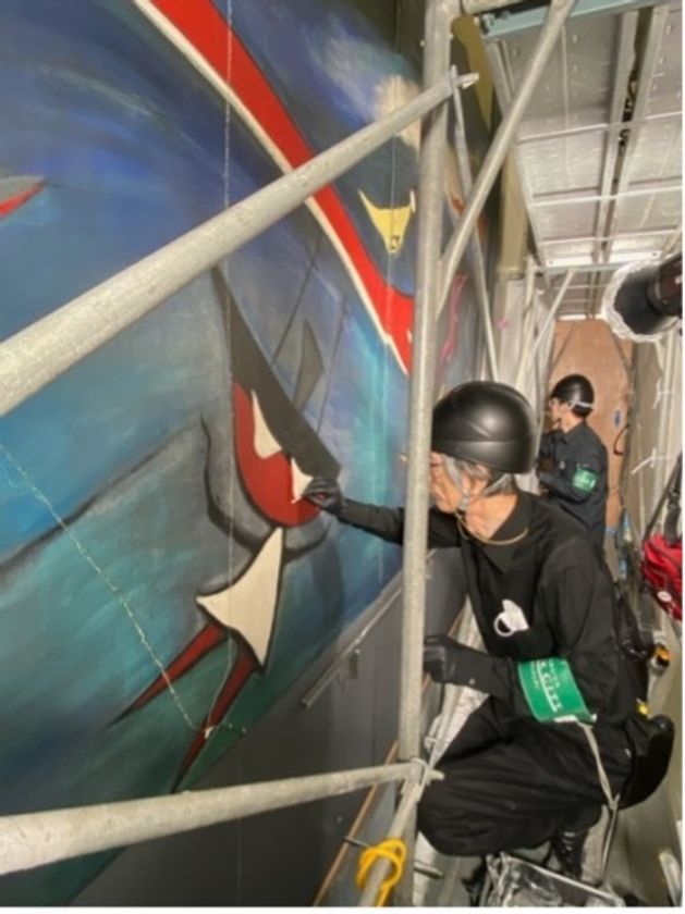 全14枚のうち、壁画左側部分の6枚(右側から9~14枚目)の亀裂・剥落・変色などを修復し、一昨年よりスタートした大規模改修は今回にて完了いたします。