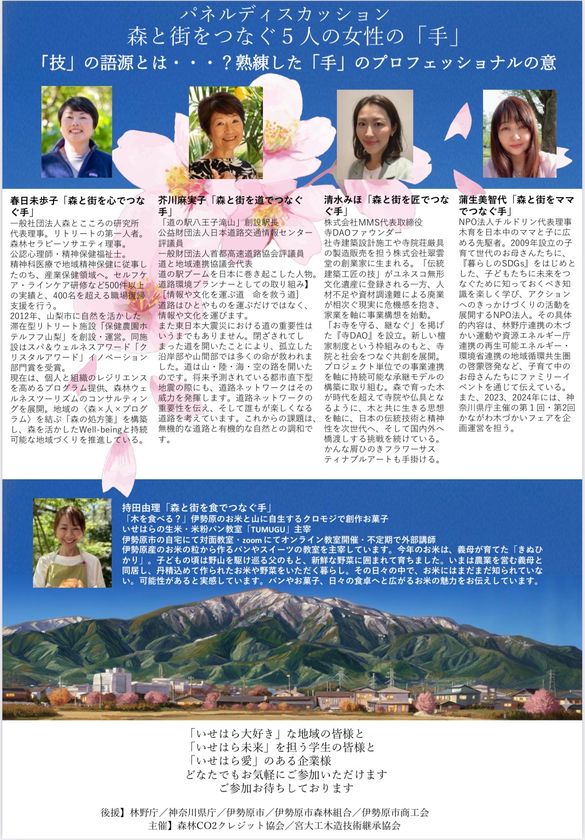 神奈川県伊勢原市は「都心から一番近い水源の森」を有し「神奈川ど真ん中のヘソ市」として、森から中山間地域や街を繋ぐ多様な川の流れ(鈴川や渋田川の清流)そして直下には相模湾の豊かな海洋が有り、この地形は「神奈川」の語源である「神の木を示す川」であることから、その美しい姿が地域のあちこちに伺えます。2万8千年前から居住が続く伊勢原独自の地勢は春夏秋冬を満喫でき「世界の理想郷」であり、まさに世界の雛型です。この素晴らしい地域環境を子どもたちに安心して継承できる未来として話し合うシンポジウムです。