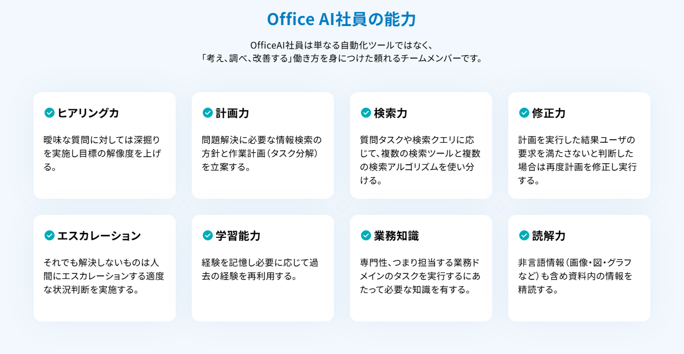こうした独自機能により、ドキュメント化されていない"組織の暗黙知"を学習し、利用するほど自社の業務や文化に適応した 「AI社員」 へと成長します。