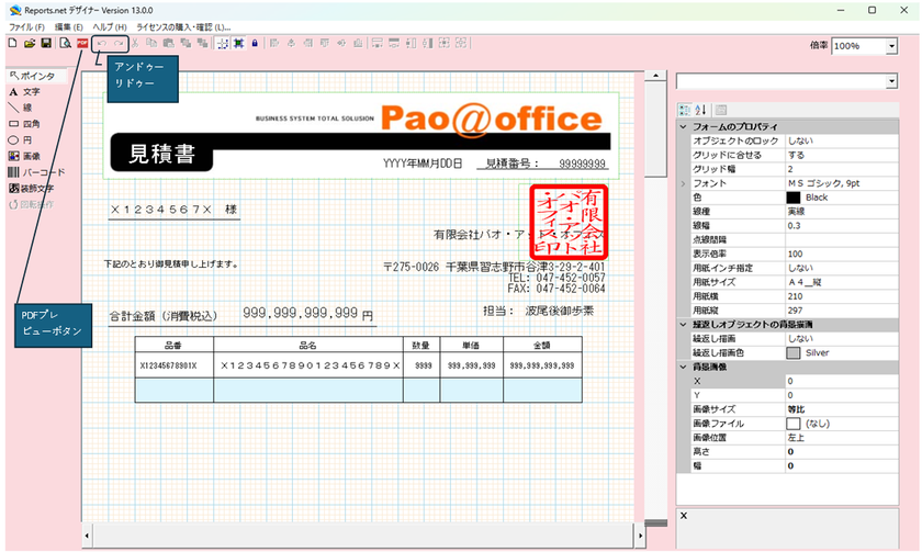 そして、今回新たに追加されたPDFプレビュー機能により、帳票デザイナーのツールバーからワンクリックで、実際にPDFに出力したときの状態を事前に確認できるようになりました。前述のPDFフォント埋め込み対応と組み合わせることで、「デザイン → PDFプレビュー → 微調整」という快適なワークフローが実現しています。