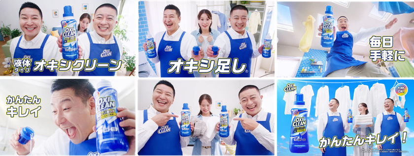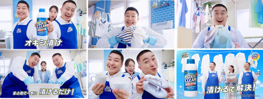 今回のCMはチョコレートプラネットのお2人が登場し、家庭の洗濯で多くの人が悩む「エリそで汚れ」「食べこぼし」「泥汚れ」などの頑固な汚れを、粉末タイプによる“オキシ漬け”で解決する様子を描きます。