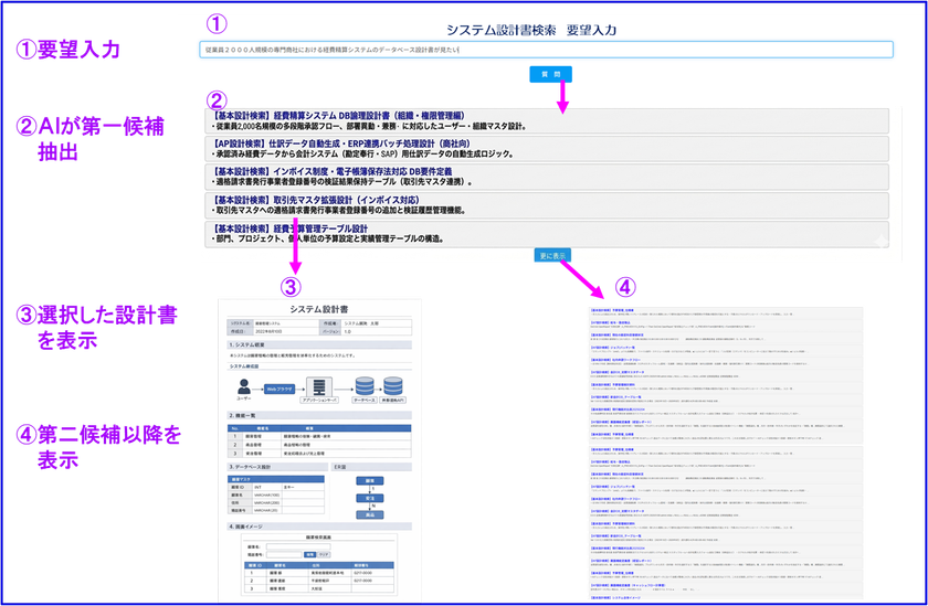こうした現状を踏まえ、過去に作成した設計書をAIに学習させ、自然文での要求だけで必要な設計書を瞬時に抽出、入手できる仕組みを開発しました。