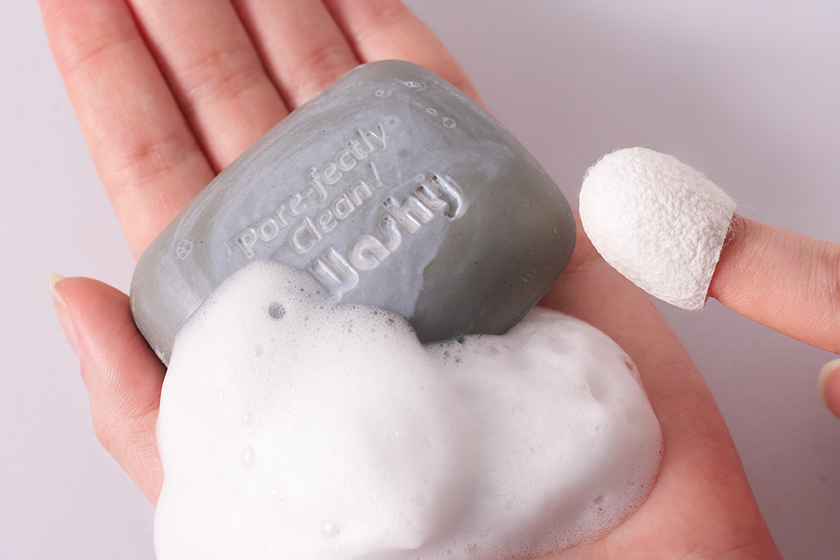 今回のリニューアルでは成分と配合量を大幅に見直し、皮脂汚れ吸着成分を従来比790%UP(※1)の高濃度配合を叶えました。毛穴の汚れを吸着洗浄する「濃厚泡」と、指にはめて磨く「天然シルクによるピーリング」のWケアで、頑固な毛穴汚れにアプローチする「毛穴づまりケアセット」として生まれ変わります。パッケージがそのまま「石けん置き」になる新発想のデザインで、置き場に困ることなく始められる「本気の毛穴磨き習慣」を提案します。