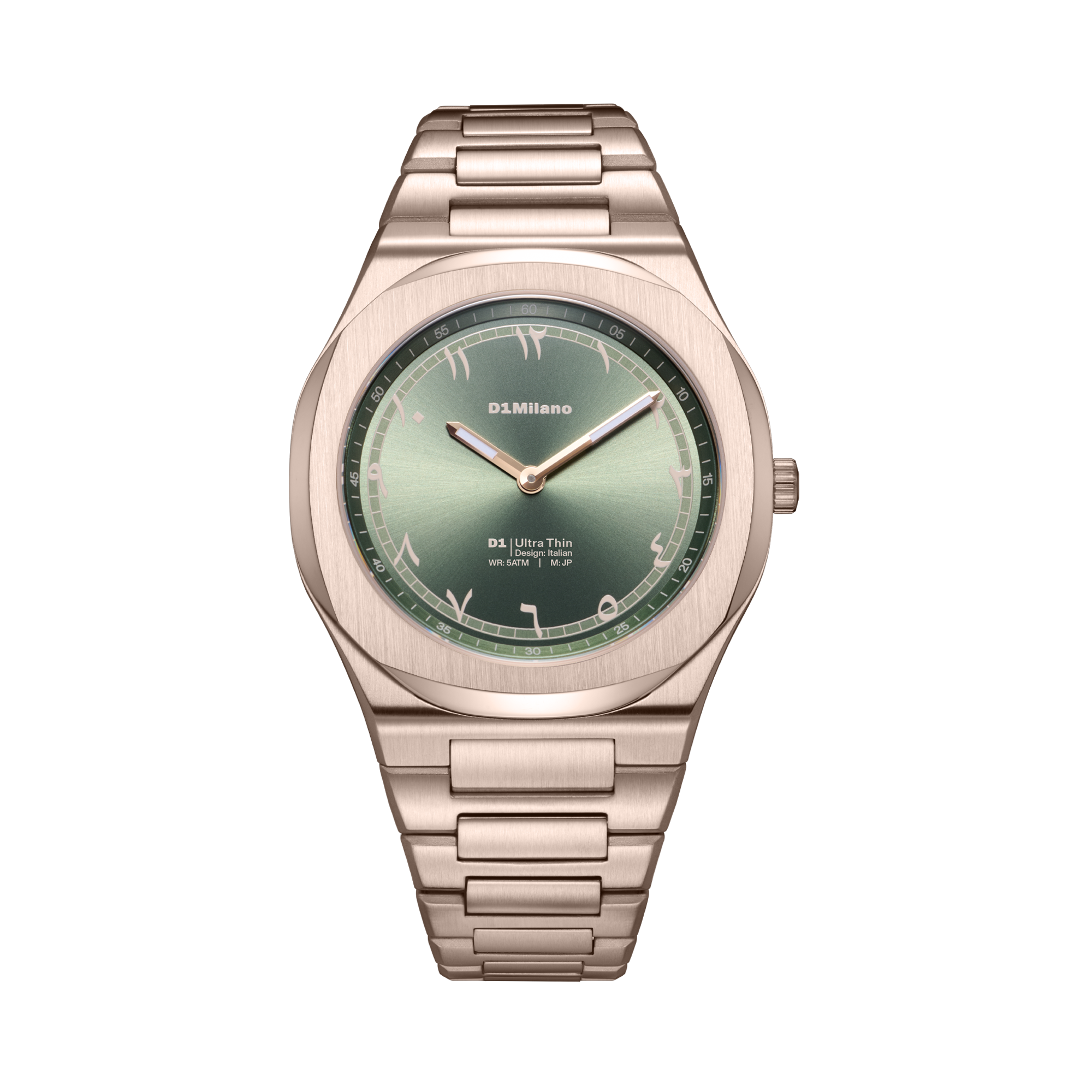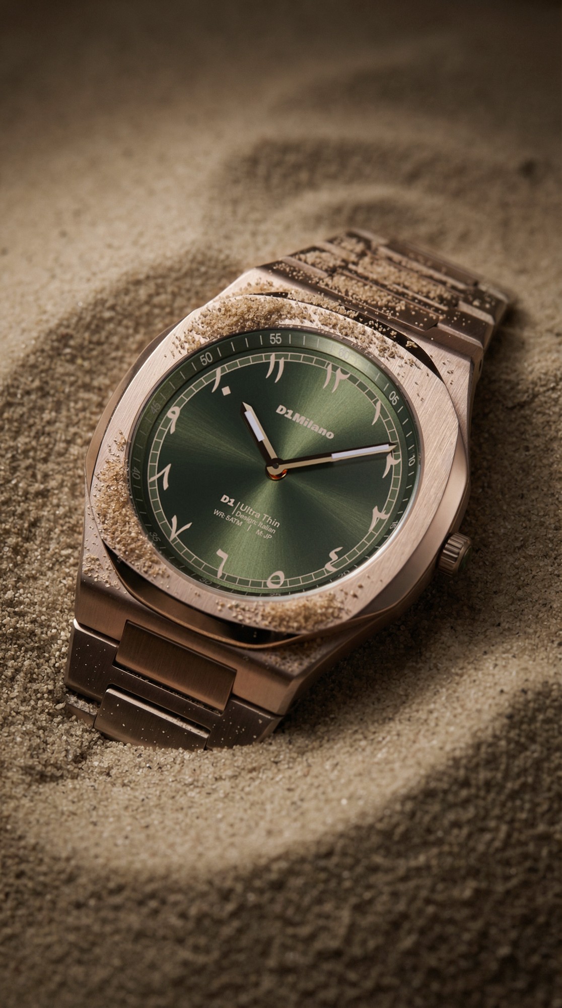 深みのあるオリーブグリーンダイヤルに、外周へ配置したアラビア数字モチーフを組み合わせたデザイン。ミニマルなフェイスの中にさりげないアクセントを加え、静かな存在感を演出します。