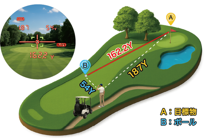 ボールの位置まで行かなくても、カートなどの離れた場所から目標物までの距離計測が可能です。