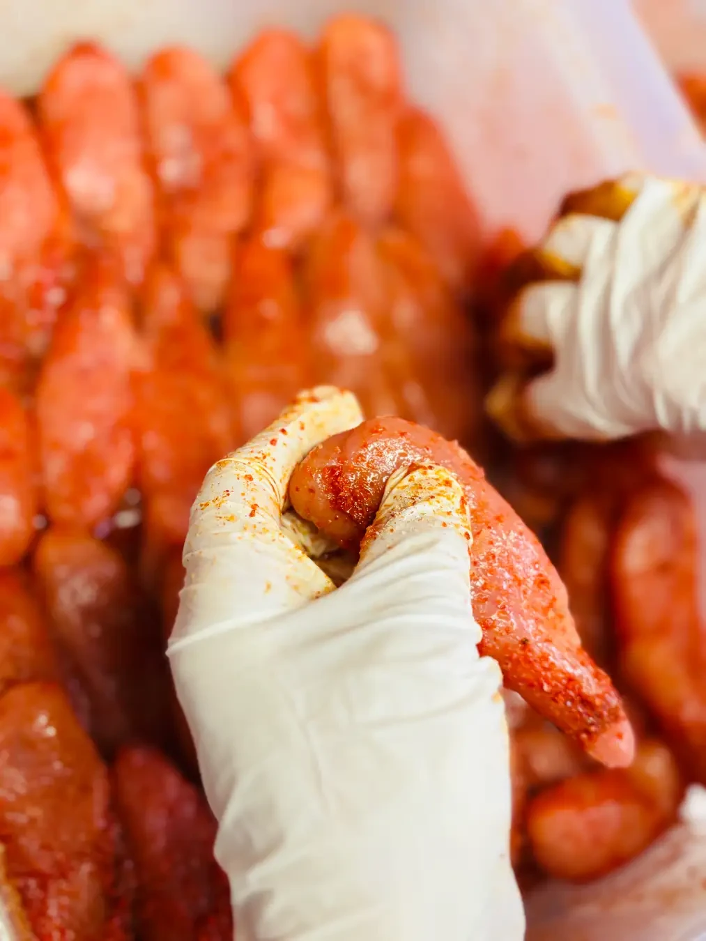一般的な辛子明太子は、日本酒や焼酎などを用いた調味液で仕込まれることが多い中、明太ねぇさんの辛子明太子は酒類および外部からの水分を一切使用しない「無水製法」を採用しており、業界初の試みです。