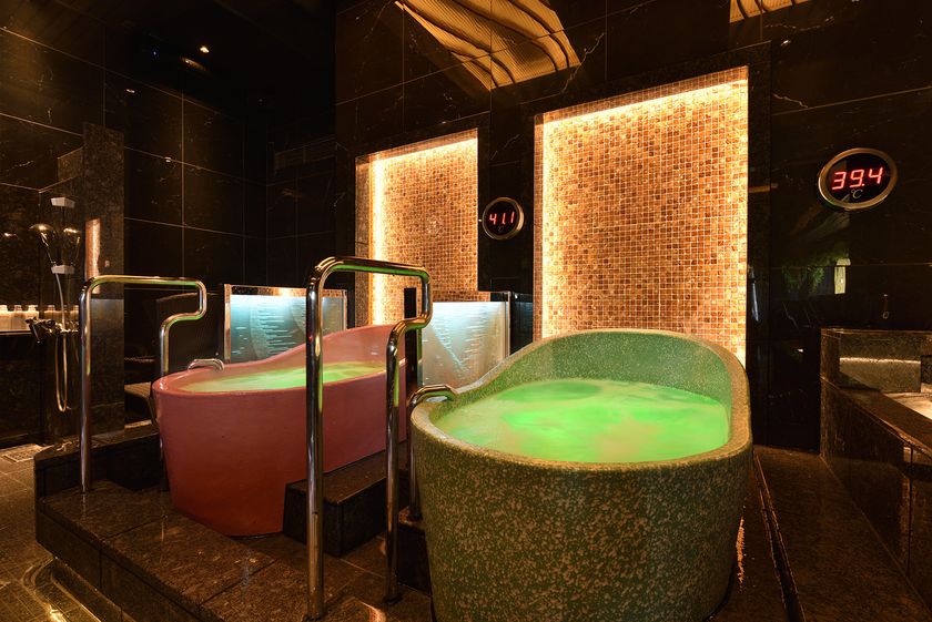 温冷交代浴に欠かせない「熱湯」をはじめ、自分だけの贅沢な時間を楽しめるパーソナル湯舟「美泡の壺」、浴槽全体から湧き出す無数のミクロの泡が肌をやさしく包み込む「泡の湯」など、さまざまなお風呂を楽しむことができます。