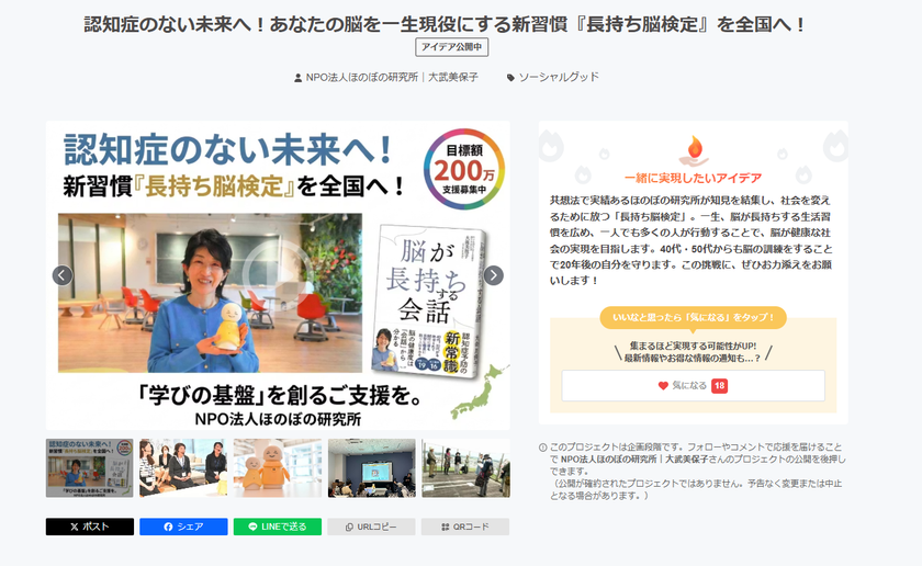 ※NPO法人ほのぼの研究所では、「長持ち脳検定」の普及を目的としたクラウドファンディングも近日中に開始予定です。ぜひお気に入り登録からご支援をお願いいたします!
