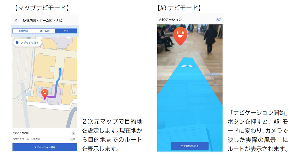さらに、目的地までのルートとして「最短ルート」に加え、鉄道事業者のARナビゲーション機能としてはこれまでに例のない「エレベーター優先ルート」を選択できる機能を試験的に導入し、用途に応じて2種類のルートから選択できるようにします。
