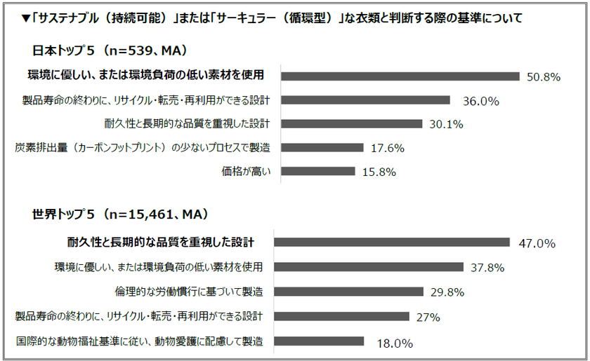 「サステナブル(持続可能)」や「循環型」な衣服から連想される特徴について、世界全体では「耐久性があり長持ちする品質(47%)」が最も多く挙げられました。対照的に、日本の回答では「環境に配慮した、または環境負荷の低い素材で作られている(50.8%)」がトップでした。次いで「寿命を迎えた際にリサイクル、再販、再利用できるように設計されている(36%)」、「耐久性(30.1%)」と続くなど、サステナビリティに対する解釈には地域差があることが明らかになりました。