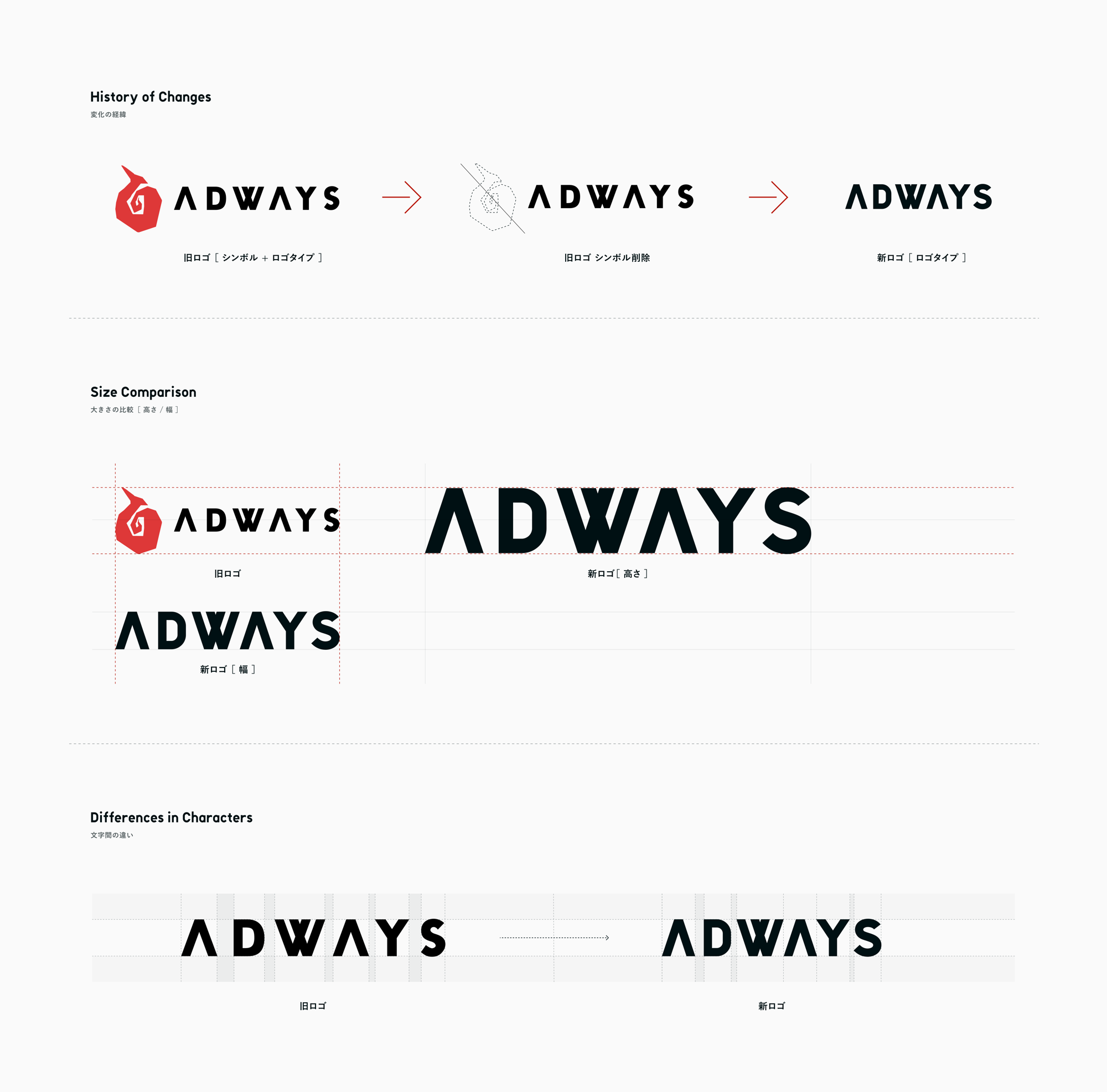 シンボルの有無やサイズ・文字間隔の違い等、新旧ロゴの比較